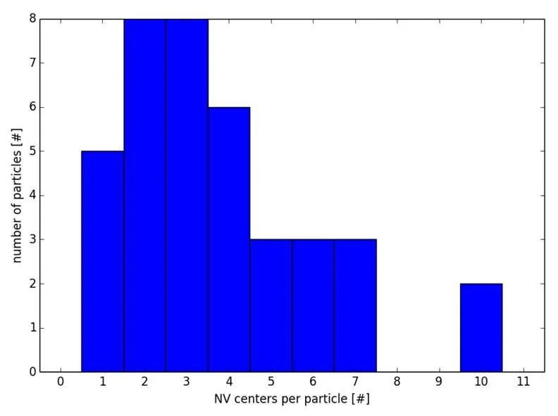 Figure 7: Distribution of NV centers per particle for 40nm-Lw as determined from AFM-Confocal single particle characterization. Courtesy T. Oeckinghaus, U. Stuttgart.
