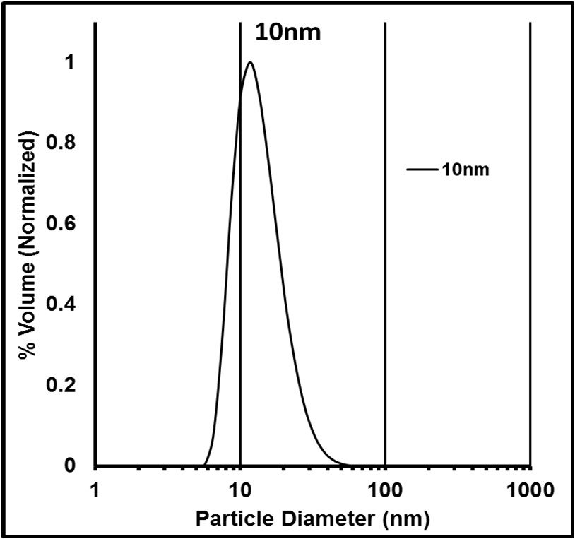 Figure 5: DLS size distribution of 10nm particles in DI water. Measured with Malvern Zetasizer Nano ZS (Malvern Instruments Ltd. UK)