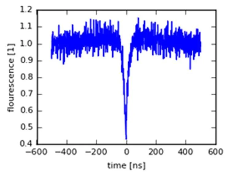Figure 3: g(2) autocorrelation function of 8nm particle exhibiting spin coherence consistent with NV- presence. Courtesy T. Oeckinghaus, U. Stuttgart.