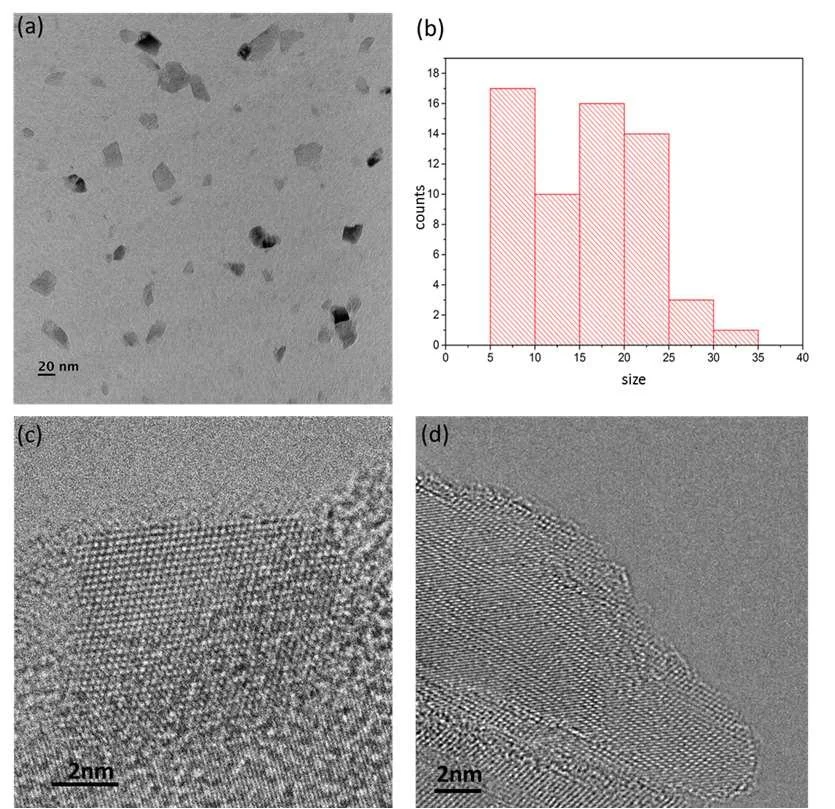 Figure 2: High Resolution TEM (HRTEM) images and size distribution of 10nm-Md particles. Courtesy S. Chang, U. Arizona.