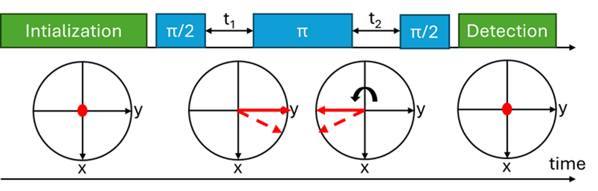 Similarly to the Rabi oscillations protocol, the Hahn echo experiment extends the microwave pulse sequence inserted between the optical initialization and detection pulses. However, instead of a single microwave pulse, a three-pulse sequence π⁄2 – π – π⁄2 is used, where the π pulse length is calibrated from the period of the Rabi oscillations (2 π representing the oscillation period in time units). After building up spin polarization during the initialization phase, a first π⁄2 pulse rotates the polarization vector on the Bloch sphere from the z axis to the xy-plane. Following a fixed evolution time t₁, a π pulse is applied, which flips the dephasing spins along the x axis, effectively reversing their order. As a result, spins that were dephasing faster now lag behind by time t₁. Finally, a third π⁄2 pulse is applied at time t₂ after the previous pulse, projecting the recovered spin coherence back onto the measurable z axis (Figure 4.1). Due to symmetry, the fluorescence signal (reflecting spin polarization) is expected to reach a maximum when t₂ = t₁. Hence sweeping t₂ around t₁ results in a detectable Gaussian-shaped echo (Figure 5.1 top trace window). In this way, the influence of static or low frequency inhomogeneities (but not rapid stochastic perturbations) that cause spin dephasing is eliminated from the echo amplitude. The overall rate of transversal dephasing T₂* is still visible in the echo and can be estimated from the echo width.